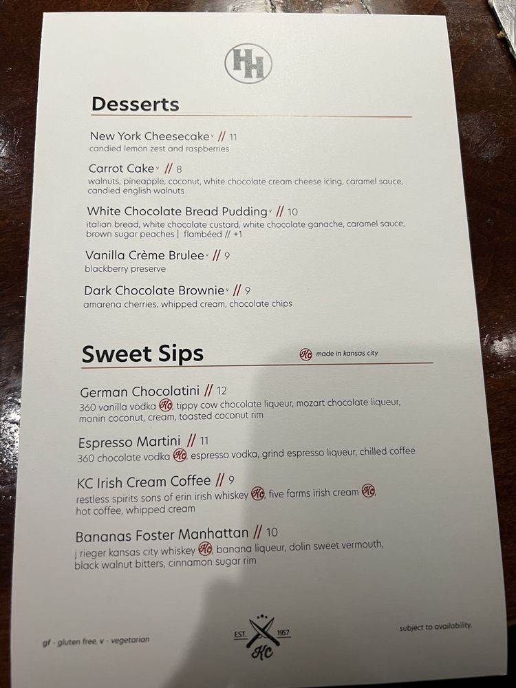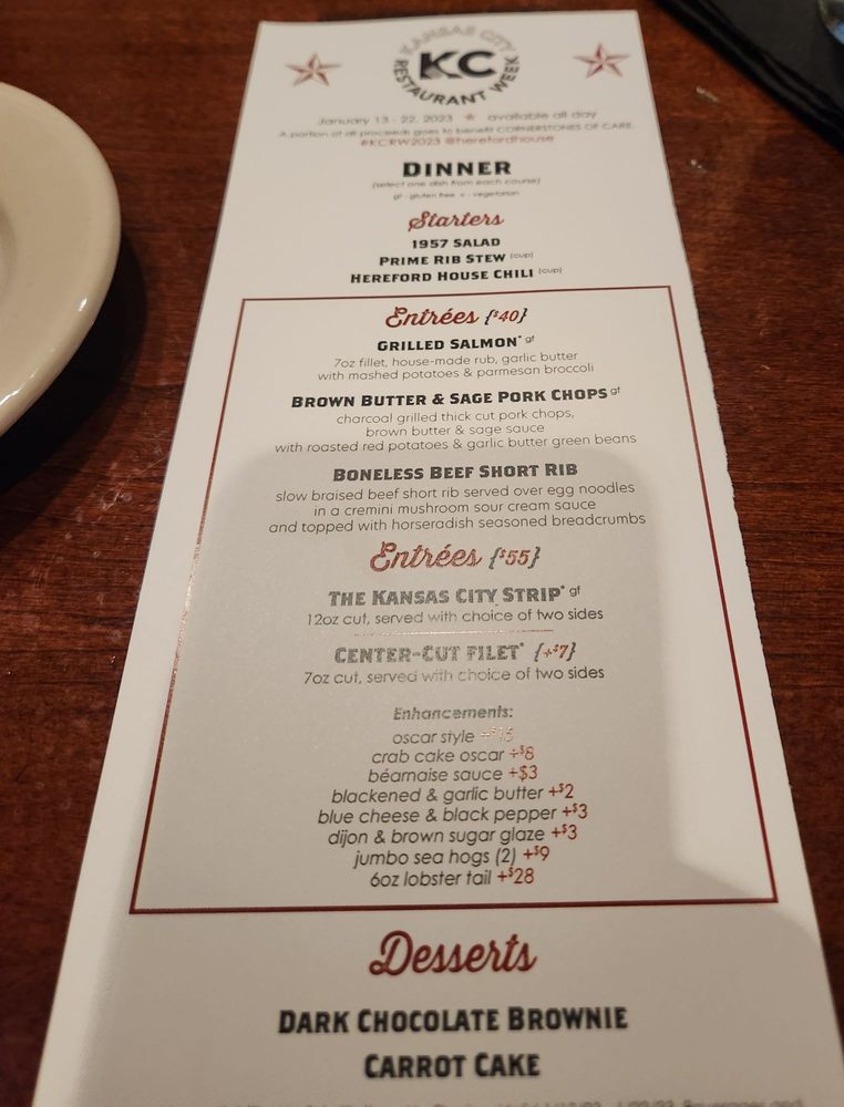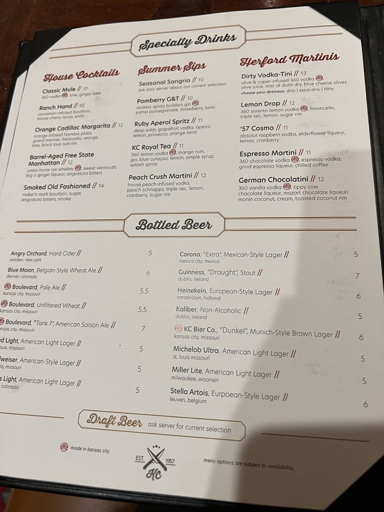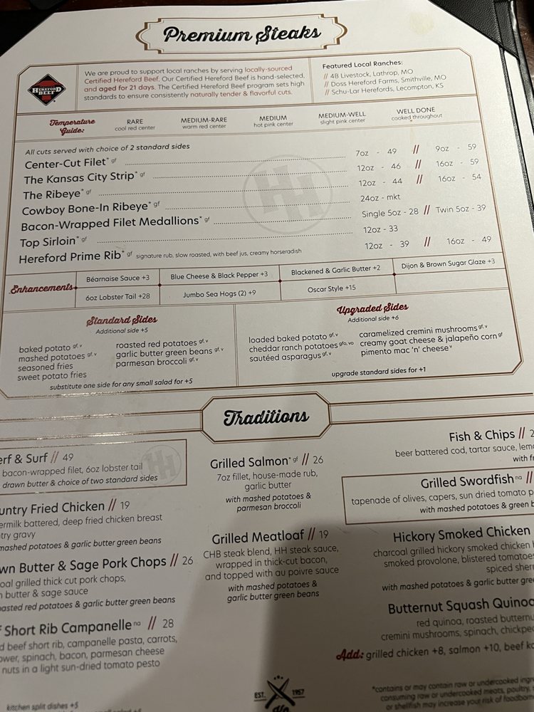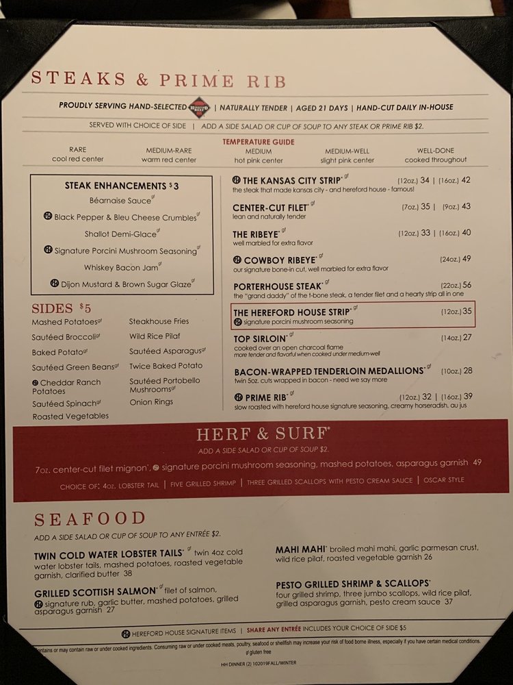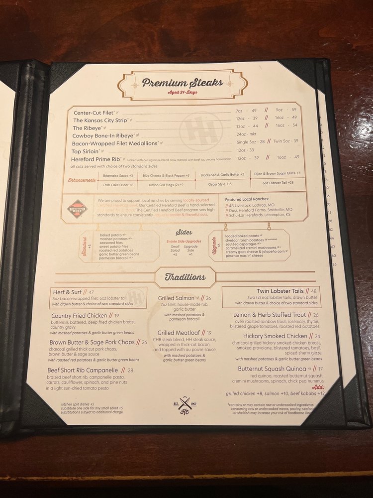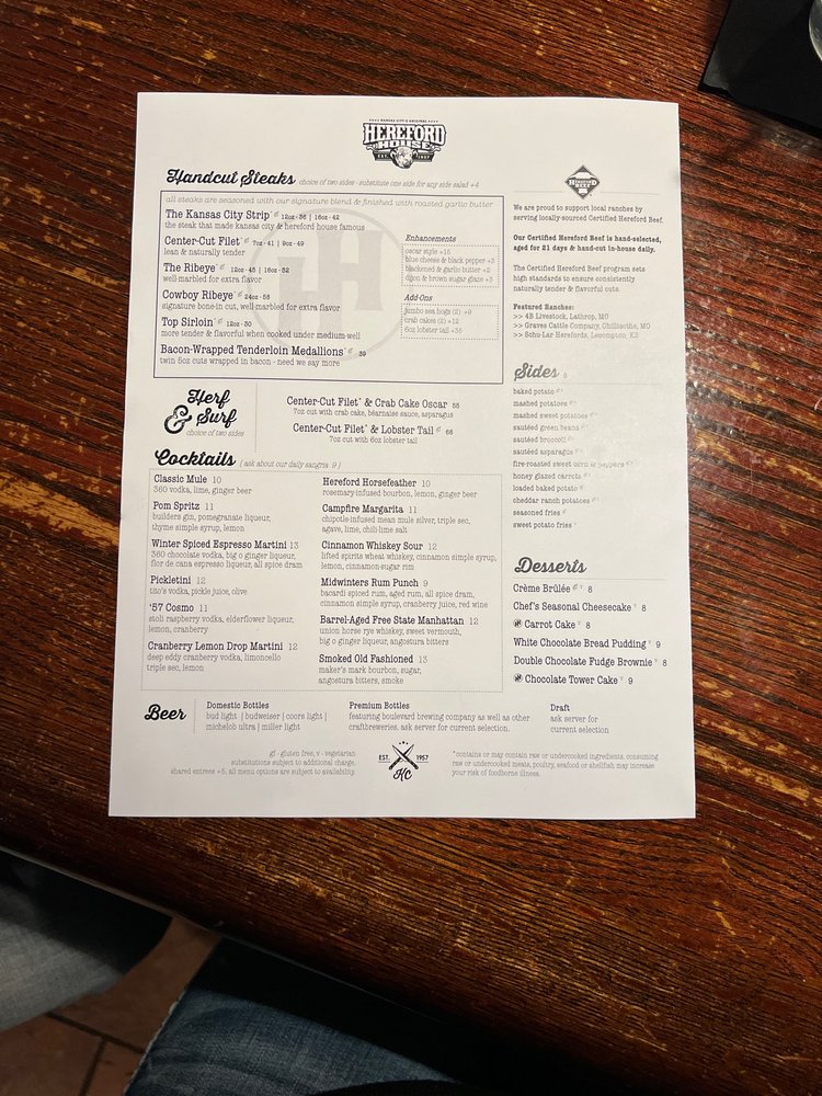 Introducing the menu at Hereford House, a classy and women-owned restaurant in Independence, MO. This establishment offers a variety of options, including delicious ribeye steaks and country fried chicken. With vegan options available, the menu caters to various dietary preferences. The Monday specials feature bacon-wrapped tenderloin medallions, while Tuesdays showcase the famous HH KC strip steak. Customer reviews rave about the quality of the food, with highlights including the best ribeye steak, cast iron cornbread perfection, and delightful bread pudding. The ambiance, service, and portions at Hereford House receive high praise, making it a must-visit spot for a satisfying meal.
